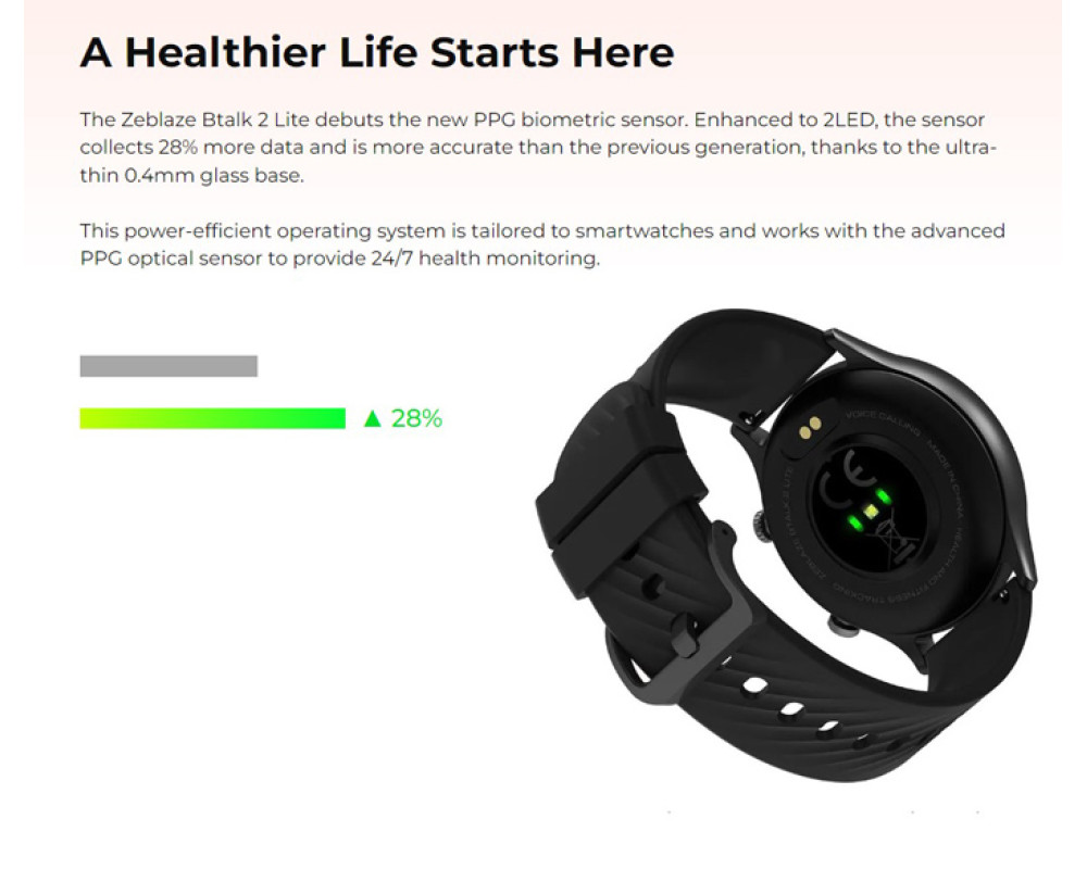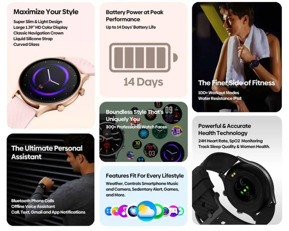 Διαθέτει πληθώρα fitness χαρακτηριστικών και αισθητήρα καρδιακών παλμών. Εξοπλίζεται με εντυπωσιακή έγχρωμη οθόνη αφής 1.39" IPS και υποστηρίζει πραγματοποίηση και απάντηση κλήσεων απευθείας από το smartwatch.