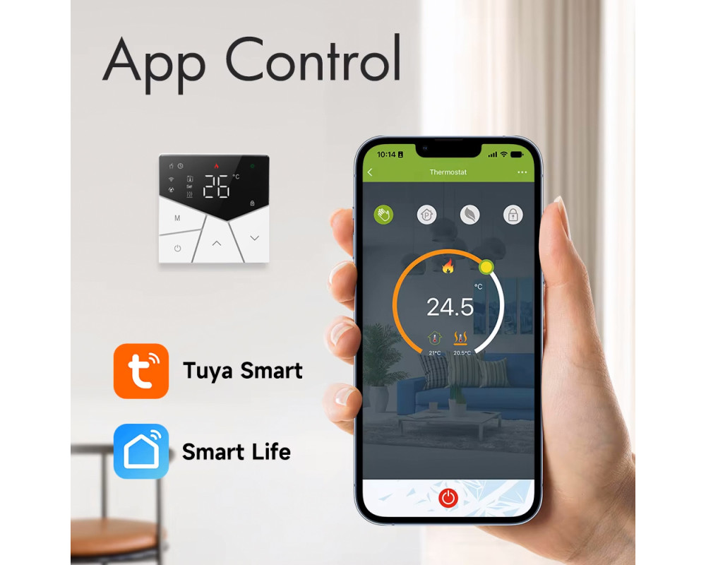 Συνδέεται με smartphone μέσω WiFi και της εφαρμογής Smart Life, επιτρέποντας σας τον απομακρυσμένο έλεγχο του θερμοστάτη από την συσκευή σας.