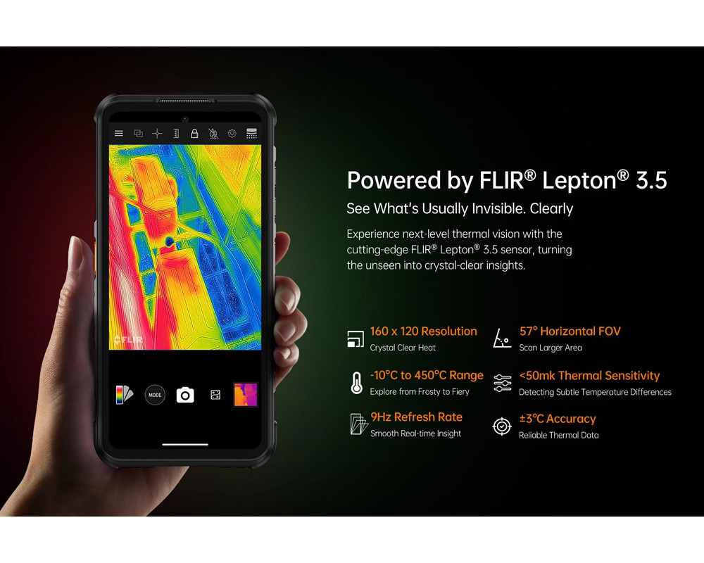 Το Xever 7 Pro ενσωματώνει αισθητήρα θερμικής εικόνας FLIR που σας επιτρέπει να ανιχνεύετε με θερμική εικόνα, θερμοκρασίες από -10 °C έως 450 °C.