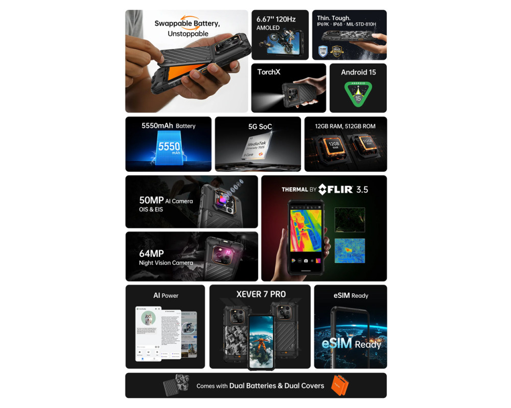 Με πιστοποίηση IP68/IP69K και πρότυπο MIL-STD-810H, το Xever 7 Pro είναι σχεδιασμένο για να αντέχει σε ακραίες συνθήκες χρήσης και περιβάλλοντα.
