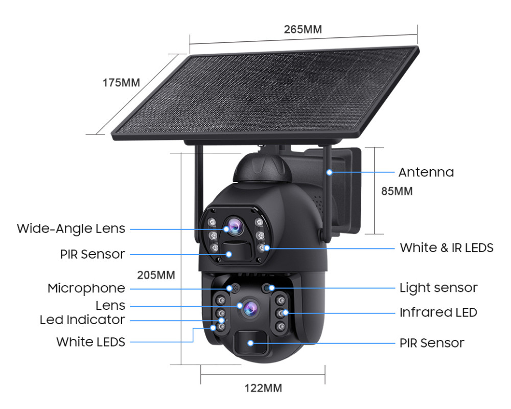 -Dimensions: Camera: 122 x 205mm, Panel: 175 x 265mm