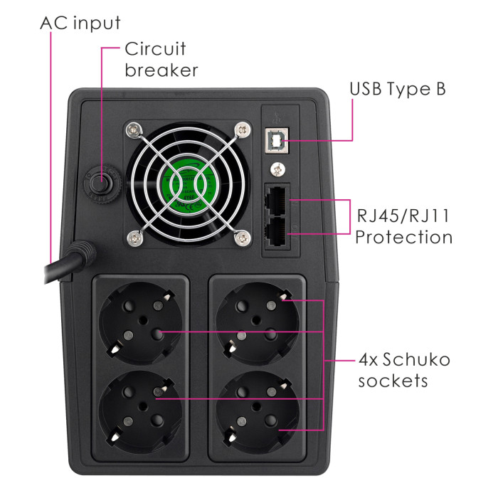 -έξοδος: 4x Schuko, 2x RJ45/RJ11, 1x USB Type B