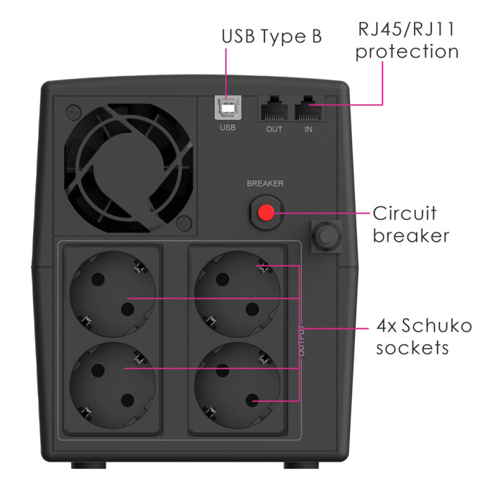 Output: 4x Schuko, 2x RJ45/RJ11, 1x USB Type B