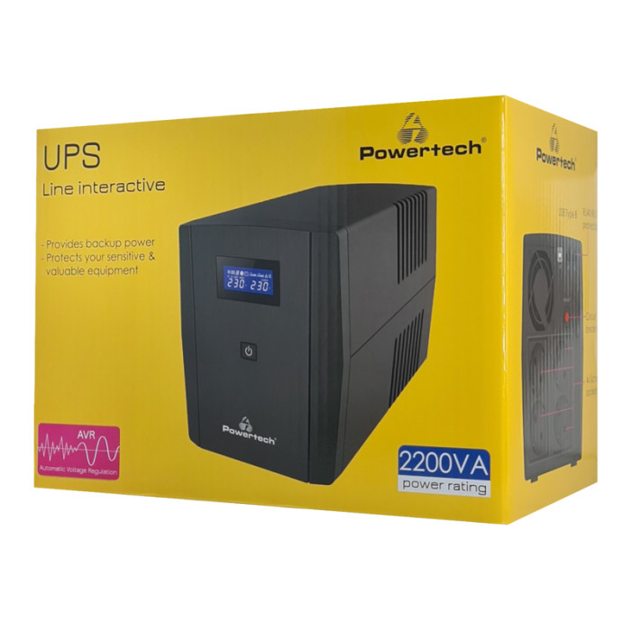 POWERTECH UPS Line Interactive PT-1298 με οθόνη, 2200VA, 1320W, 4x Schuko, 2x RJ45/RJ11, USB Type B