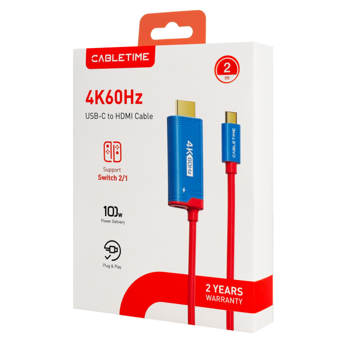 Καλώδιο της Cabletime για τη σύνδεση μιας οθόνης HDMI με μια συσκευή μέσω θύρας USB-C. Διαθέτει θύρα τροφοδοσίας USB-C που υποστηρίζει φόρτιση με απόδοση έως 100W. Είναι ιδανικό για gaming κονσόλες όπως το Nintendo Switch 1/2.