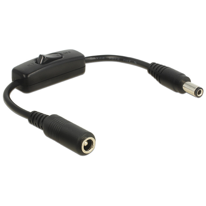 This cable by Delock can be connected to a DC power port. By using the on / off switch the power supply for the connected device can be switched on or off. Therefor it is not needed to remove the cable from the female port to switch off the power supply.