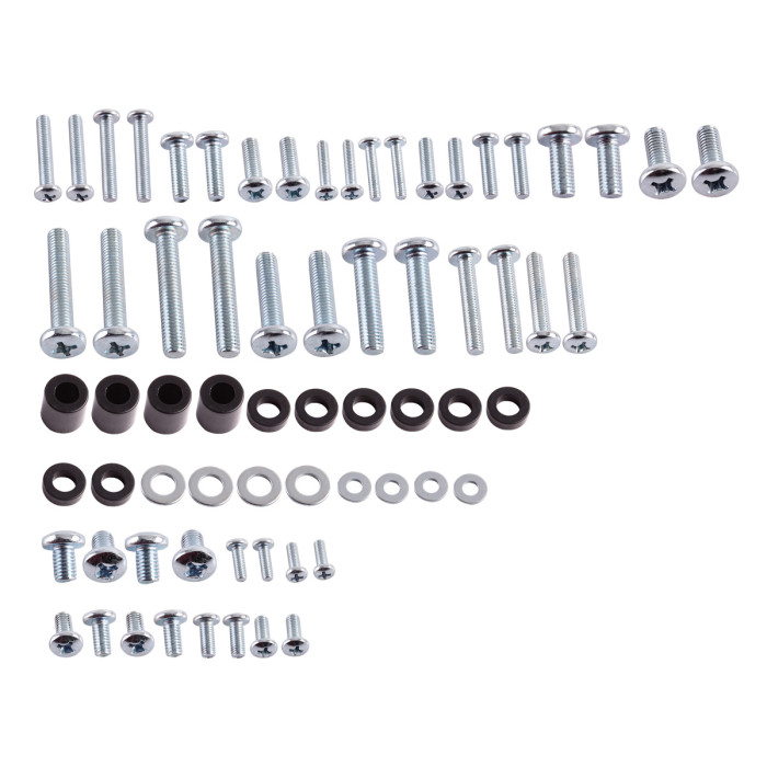 Κιτ βιδών με ροδέλες και αποστάτες σε διάφορα μεγέθη, ιδανικά για την εγκατάσταση τηλεόρασης σε βάση.