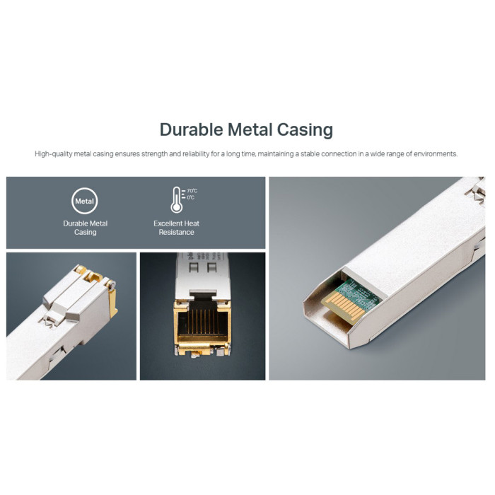 Το TL-SM5310-T παρέχει ανώτερη απόδοση 10G για εύκολη και γρήγορη σύνδεση μεταξύ της διεπαφής SFP+ και της θύρας RJ45. Καλύπτει έως και 30m* στα 10 Gbps (UTP cat.6a ή παραπάνω) . Ο σχεδιασμός plug-and-play διευκολύνει την ανάπτυξη, χωρίς να χρειάζεται τεχνικός. Το υψηλής ποιότητας μεταλλικό περίβλημα εξασφαλίζει αντοχή και αξιοπιστία για μεγάλο χρονικό διάστημα, διατηρώντας μια σταθερή σύνδεση σε ένα ευρύ φάσμα περιβαλλόντων.