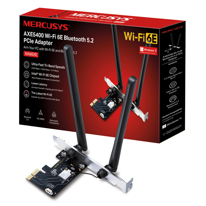 Η κάρτα δικτύου MA86XE της Mercusys συνδέεται στον υπολογιστή σας μέσω PCIe υποδοχής δίνοντας σας την δυνατότητα να συνδεθείτε ασύρματα στο δίκτυο με γρήγορες ταχύτητες Wi-Fi 6E έως 5.4Gbps. Επιπλέον, προσφέρει στον υπολογιστή σας τεχνολογία Bluetooth 5.2, που σας επιτρέπει να συνδέσετε ασύρματα στον υπολογιστή, συσκευές Bluetooth, όπως ποντίκια και πληκτρολόγια.