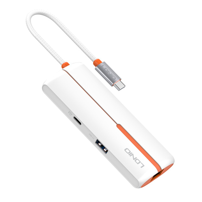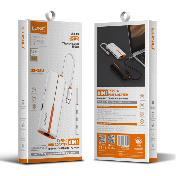 LDNIO USB hub DS-26U με θύρα δικτύου, 6 θυρών, USB-C σύνδεση, 100W PD, λευκό