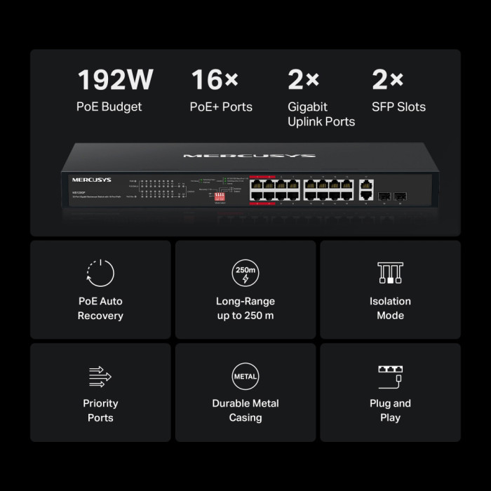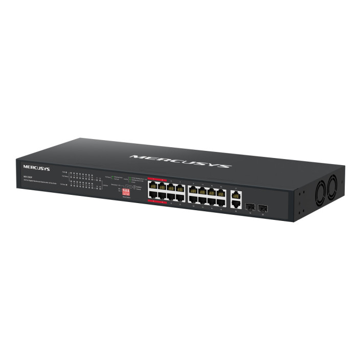 Το rackmount switch της Mercusys σας επιτρέπει να επεκτείνετε το ενσύρματο δίκτυο σας με 16x Gigabit PoE+ θύρες, 2x Gigabit χωρίς PoE θύρες και 2x SFP υποδοχές.