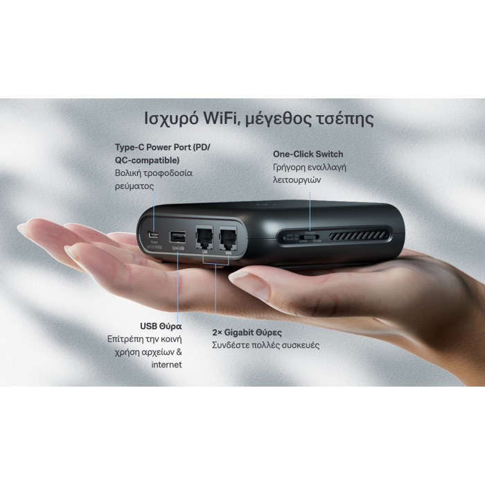 Τροφοδοτήστε το με ένα Power Bank: Με μια διεπαφή Type-C, μπορείτε να το μετατρέψετε ευέλικτα σε κινητό δρομολογητή με power bank.