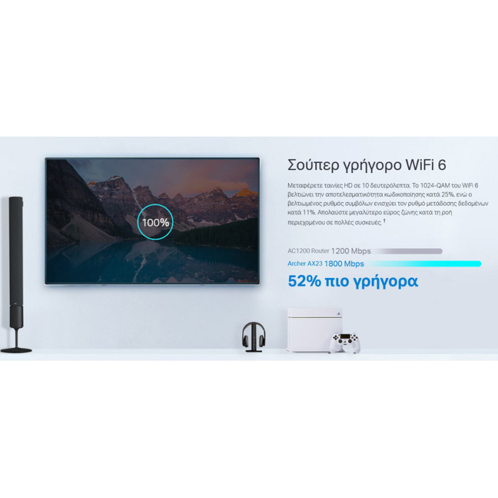 Το Archer AX23 χάρη στο τελευταίας γενιάς WiFi 6, προσφέρει γρηγορότερες ταχύτητες, λιγότερη καθυστέρηση και υψηλότερη χωρητικότητα, επιτρέποντας ταυτόχρονες συνδέσεις στο οικιακό σας δίκτυο. Ολοκληρώστε απλές εργασίες, όπως αποστολή e-mail ή περιήγηση στο internet στη ζώνη 2.4 GHz με ταχύτητες έως 574 Mbps και πιο απαιτητικές εργασίες, όπως διαδικτυακά παιχνίδια ή παρακολούθηση ταινιών στη ζώνη 5 GHz με ταχύτητες έως 1201 Mbps, ταυτόχρονα και χωρίς καθυστέρηση.