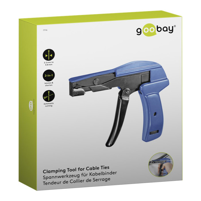 Το μεταλλικό πιστόλι της Goobay συσφίγγει και κόβει με εύκολο τρόπο δεματικά καλωδίων 2.2 έως 4.8 mm. Διαθέτει εργονομική λαβή με ρύθμιση έντασης ώστε όταν η σύσφιξη φτάσει στο όριο της ρύθμισης τότε αυτόματα κόβει το περίσσευμα του δεματικού.