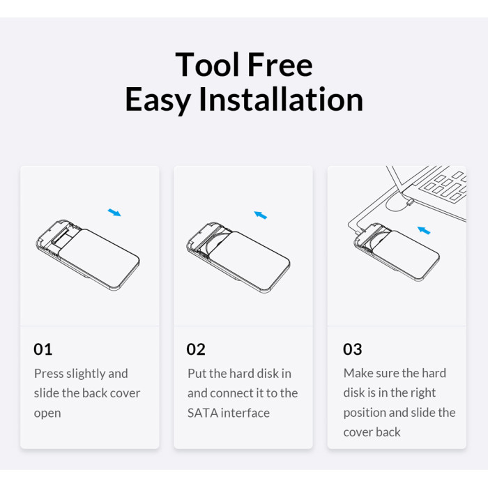 Η θήκη της ORICO επιτρέπει την σύνδεση ενός 2.5" SATA HDD ή SSD με έναν επιτραπέζιο ή φορητό υπολογιστή μέσω θύρας USB.