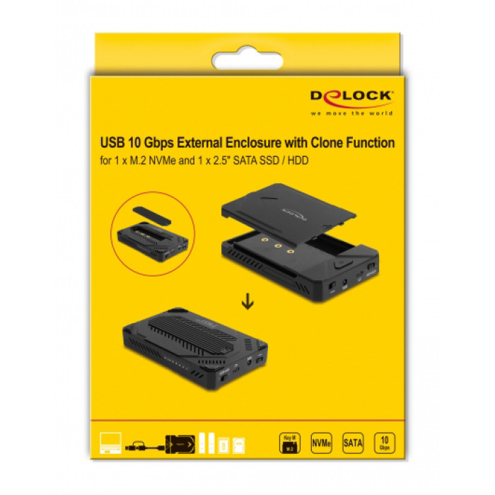 Η θήκη της Delock δίνει την δυνατότητα της ταυτόχρονης λειτουργίας M.2 NVMe SSD και 2.5" SATA HDD ή SSD, μέσω θύρας USB-C ή USB με την χρήση αντάπτορα (συμπεριλαμβάνεται). Επιπλέον υποστηρίζει λειτουργία κλωνοποίησης μνήμης από NVMe σε SATA και από SATA σε NVMe χωρίς την χρήση υπολογιστή. Η εγκατάσταση του M.2 SSD γίνεται πολύ εύκολα χωρίς να απαιτούνται εργαλεία.