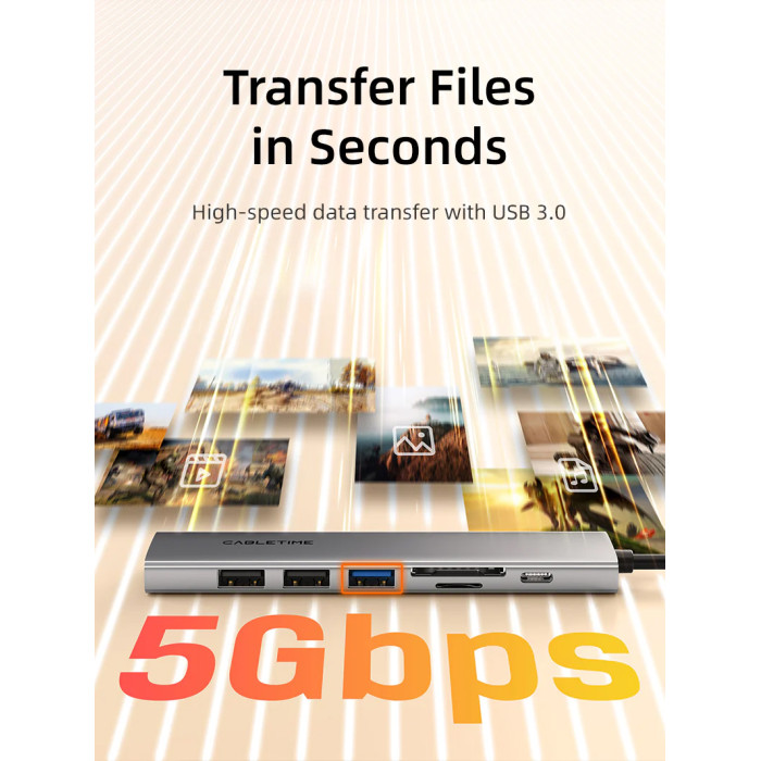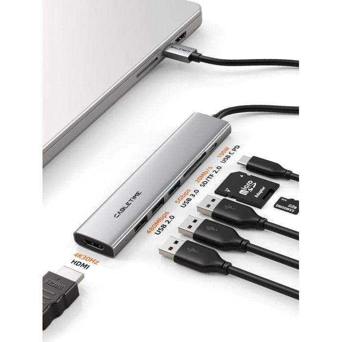 CABLETIME docking station CT-HBP2-AG7, 7 θυρών, USB-C, 4K, 100W, γκρι