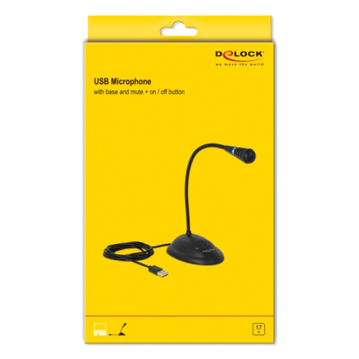 Μικρόφωνο USB της Delock με βάση από καουτσούκ του παρέχει προστασία από την ολισθηρότητα και εύκαμπτο βραχίονα που επιτρέπει στο μικρόφωνο να λυγίσει εύκολα προς την επιθυμητή κατεύθυνση. Το LED φωτάκι με την πράσινη ένδειξη LED δείχνει τη λειτουργία του μικρόφωνου και με την μπλε ή κόκκινη ένδειξη την ενεργοποίηση ή απενεργοποίησή της σίγασης αντίστοιχα. Διαθέτει ένα πλήκτρο σίγασης και ένα πλήκτρο ενεργοποίησης και απενεργοποίησης του μικροφώνου.