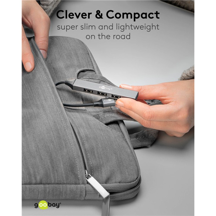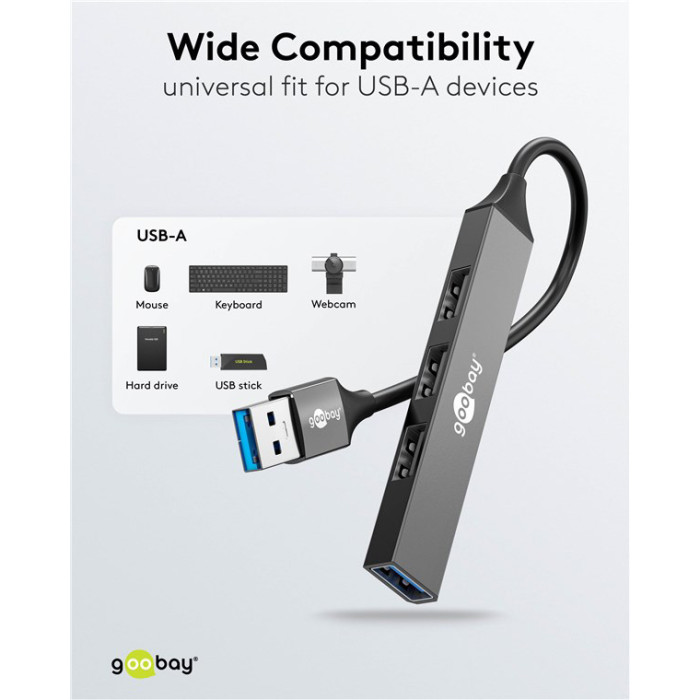 Αυτό το hub της Goobay μπορεί να συνδεθεί με το laptop ή το desktop σας μέσω θύρας USB και να επεκτείνει τις θύρες του με 4x USB θύρες. Διαφορετικές συσκευές USB, όπως εξωτερικοί σκληροί δίσκοι, card readers, ποντίκια κλπ. μπορούν να συνδεθούν μέσω του hub.