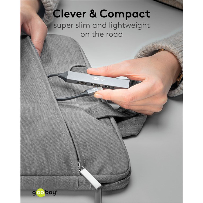 Αυτό το hub της Goobay μπορεί να συνδεθεί με το laptop ή το desktop σας μέσω θύρας USB-C και να επεκτείνει τις θύρες του με 4x USB θύρες. Διαφορετικές συσκευές USB, όπως εξωτερικοί σκληροί δίσκοι, card readers, ποντίκια κλπ. μπορούν να συνδεθούν μέσω του hub.