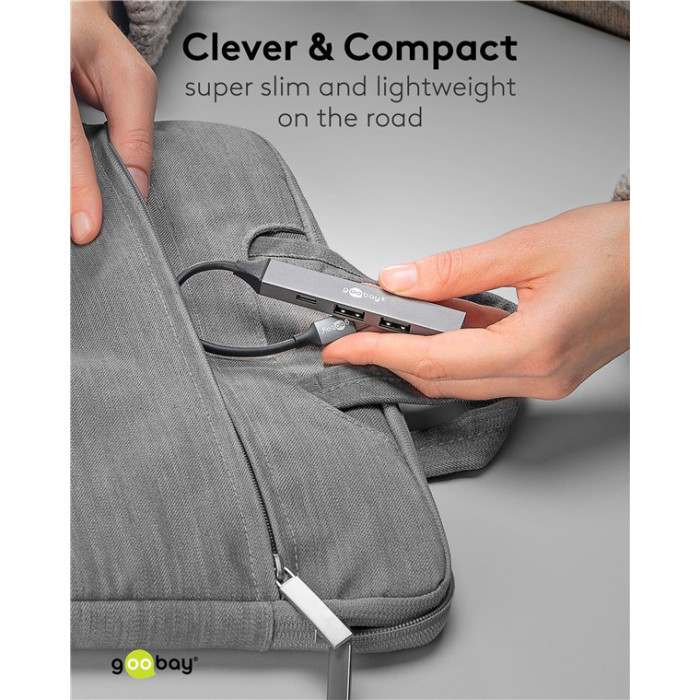 Αυτό το hub της Goobay μπορεί να συνδεθεί με το laptop ή το desktop σας μέσω θύρας USB-C και να επεκτείνει τις θύρες του με 1x USB-C και 3x USB θύρες. Διαφορετικές συσκευές USB, όπως εξωτερικοί σκληροί δίσκοι, card readers, ποντίκια κλπ. μπορούν να συνδεθούν μέσω του hub.