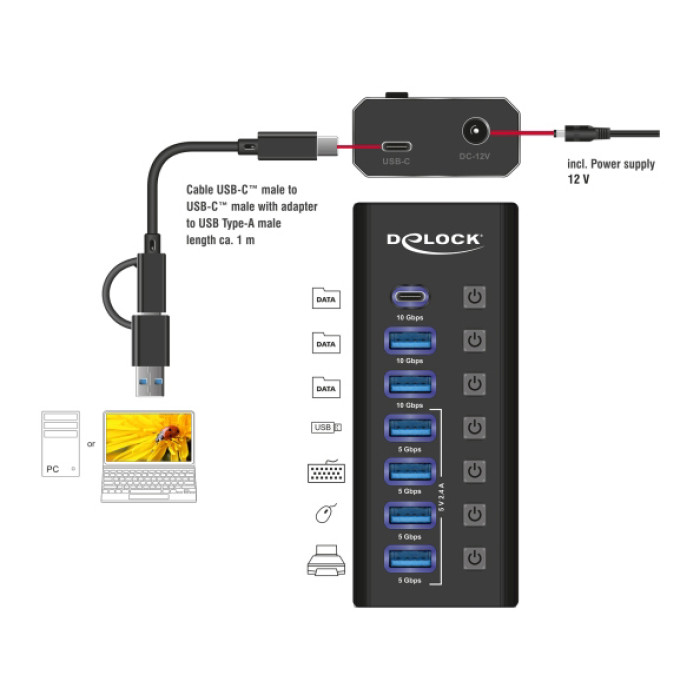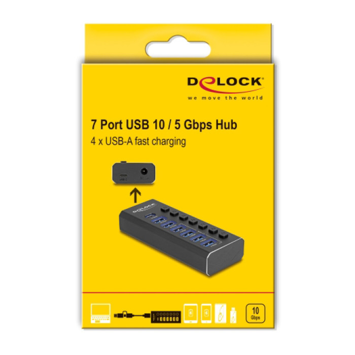DELOCK USB hub 64326 με διακόπτες, 7x θυρών, 10Gbps, USB/USB-C σύνδεση, μαύρο