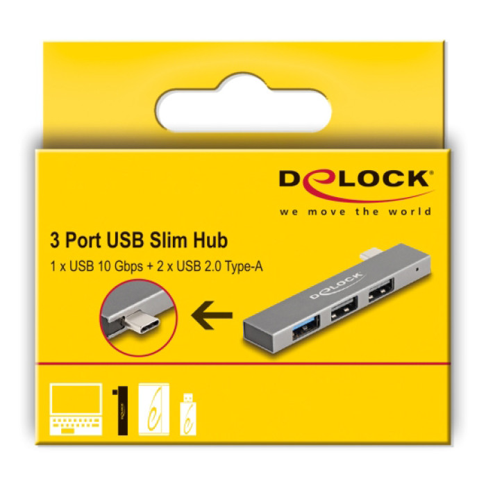 Αυτό το hub της Delock μπορεί να συνδεθεί με το laptop ή το desktop σας μέσω θύρας USB-C και να επεκτείνει τις θύρες του με 3x USB θύρες. Διαφορετικές συσκευές USB, όπως docking stations, card readers κ.λπ. μπορούν να συνδεθούν μέσω του hub.