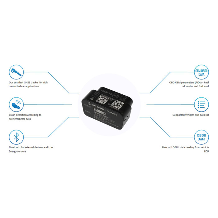 Το FMB003 είναι ένα εξαιρετικά μικρό, plug and play GPS tracker. Το κύριο χαρακτηριστικό του FMB003 είναι η δυνατότητα ανάγνωσης παραμέτρων OEM (PIDs) μέσω θύρας OBD. Με αυτήν τη συσκευή, θα μπορείτε να διαβάζετε δεδομένα οδόμετρου και επιπέδου καυσίμου.