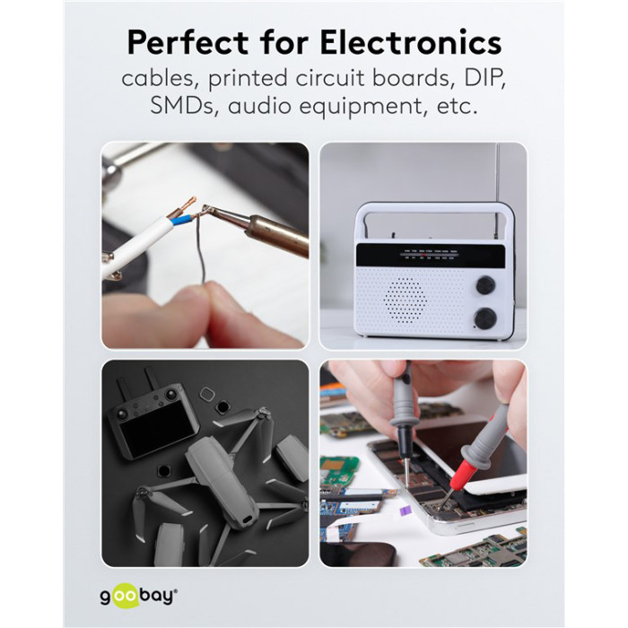 Σύρμα συγκόλλησης της Goobay, κατάλληλο για εργασίες συγκόλλησης σε ηλεκτρικά εξαρτήματα και συσκευές όπως πλακέτες κυκλωμάτων, PCBs, SMDs, DIP, καλώδια, τηλεοράσεις, ακουστικά ή μικρόφωνα