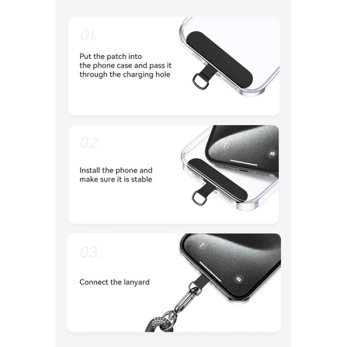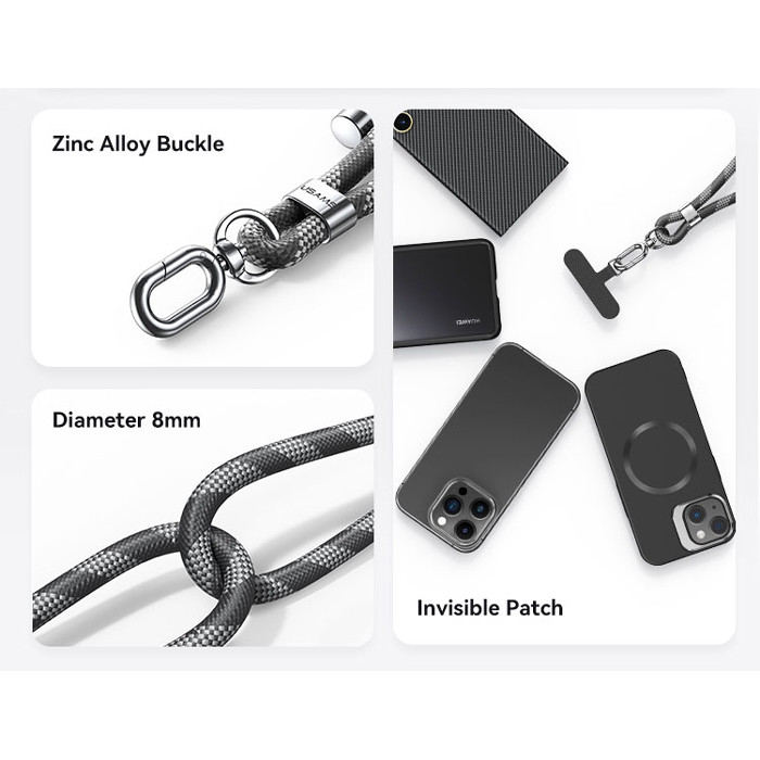 Είναι ρυθμιζόμενο και αποτελείται από 2 μέρη, το κορδόνι και ένα υφασμάτινο κομμάτι το οποίο τοποθετείται στο εσωτερικό της θήκης του κινητού, επιτρέποντας το κρέμασμα του από τον γάντζο του κορδονιού.