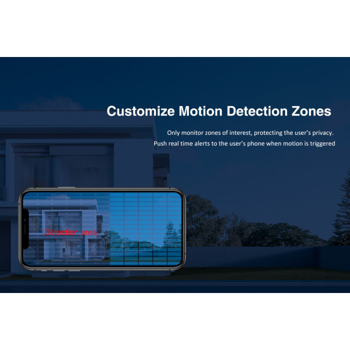 Μπορεί να ανιχνεύσει την ανθρώπινη σιλουέτα και κίνηση, στέλνοντας ειδοποιήσεις στο smartphone σας κάθε φορά που ανιχνεύεται κίνηση αλλά και να ενεργοποιήσει ηχητικό και οπτικό (με φως) συναγερμό.