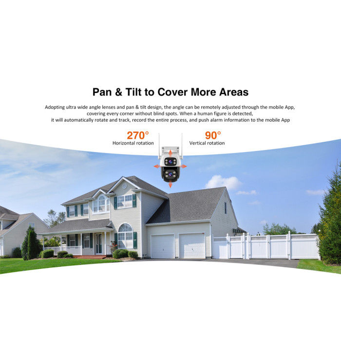 Ενσωματώνει 2 φακούς που επιτρέπουν μεγαλύτερη κάλυψη στον χώρο και υποστηρίζει PTZ λειτουργία που σας επιτρέπει την οριζόντια και κάθετη μετακίνηση της κάμερας μέσω της εφαρμογής.