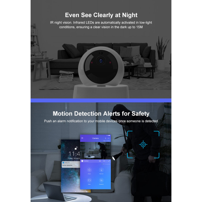 Λειτουργίες: remote control, two-way audio, motion detection, share control, activity alert, push notification, RTSP protocol, TF card storage