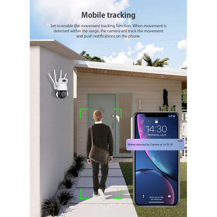 Υποστηρίζει αμφίδρομη μεταφορά φωνής και ήχου, σύνδεση WiFi και ο χειρισμός της μπορεί να γίνει απομακρυσμένα μέσω συσκευής smartphone και της εφαρμογής IPC360 Home . Η κάμερα διαθέτει προβολείς που ενεργοποιούνται όταν εντοπίζει κίνηση και ειδοποιεί τον ιδιοκτήτη με push notifications απευθείας στο κινητό.