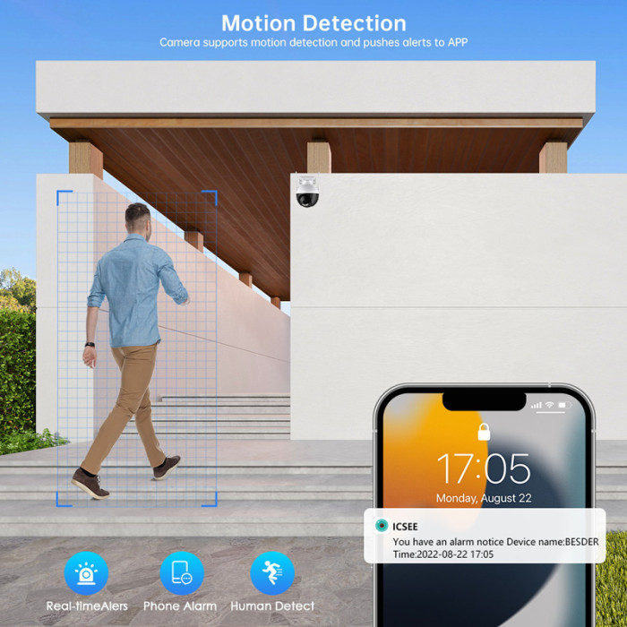 Ρυθμίζεται εύκολα και ελέγχεται από smartphone μέσω της δωρεάν εφαρμογής iCSee. Μπορεί να ανιχνεύσει κινήσεις, στέλνοντας ειδοποιήσεις στο smartphone σας κάθε φορά που ανιχνεύεται κίνηση και εξοπλίζεται με υψηλής ποιότητας μικρόφωνο που επιτρέπει την αμφίδρομη μεταφορά φωνής και ήχου.