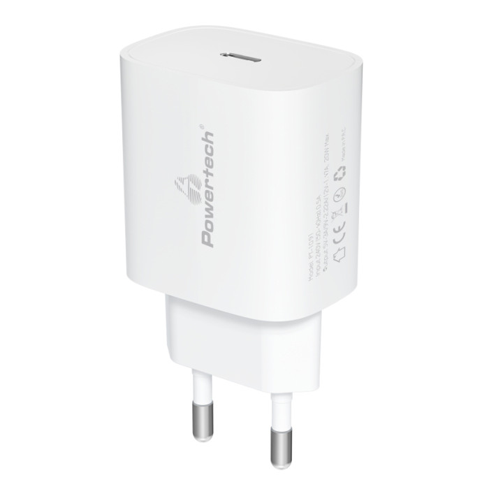 Υψηλής απόδοσης φορτιστής τοίχου της Powertech, κατασκευασμένος από ανθεκτικό υλικό και συμβατός με συσκευές που φορτίζουν μέσω θύρας USB-C. Διαθέτει USB-C θύρα εξόδου που υποστηρίζει φόρτιση με μέγιστη απόδοση 20W.