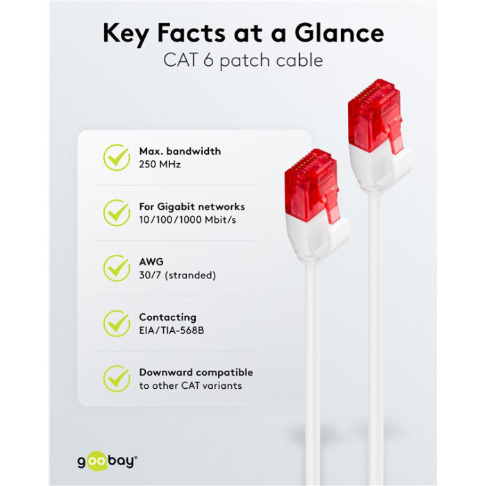 Τα καλώδια δικτύου της Goobay κατασκευάζονται από ποιοτικά υλικά, με τις υψηλότερες τεχνικές προδιαγραφές, προσφέροντας αξιόπιστη λειτουργία υψηλής απόδοσης, με αντοχή στον χρόνο.