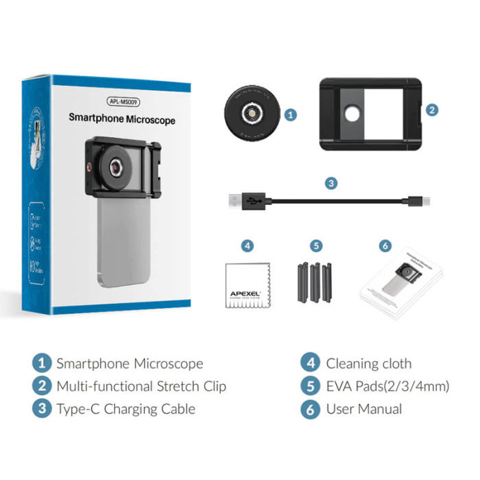 Ο φακός μικροσκόπιο APL-MS009 της Apexel αποτελεί το τέλειο αξεσουάρ για το smartphone σας! Τοποθετείται εύκολα μπροστά από την κάμερα του smartphone, επιτρέποντας σας να τραβήξετε φωτογραφίες και βίντεο, ή να παρακολουθήσετε αντικείμενα, με 100x zoom. Επιπλέον, ενσωματώνει LED φωτισμό, ο οποίος διευκολύνει την χρήση του σε πιο σκοτεινά περιβάλλοντα. Ο φωτισμός είναι επαναφορτιζόμενος και φορτίζει μέσω θύρας USB-C (συμπεριλαμβάνεται καλώδιο φόρτισης).