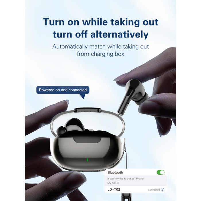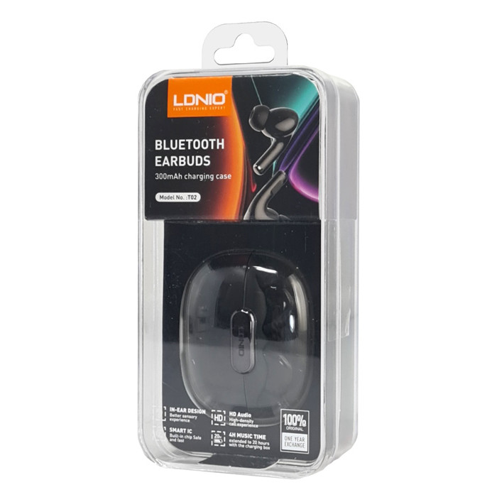 Τα true wireless earphones T02 της LDNIO προσφέρουν κορυφαία ποιότητα ήχου με τεχνολογία μείωσης θορύβου και άριστη εφαρμογή στο αυτί. Είναι συμβατά με tablets, smartphones και άλλες συσκευές που διαθέτουν Bluetooth.