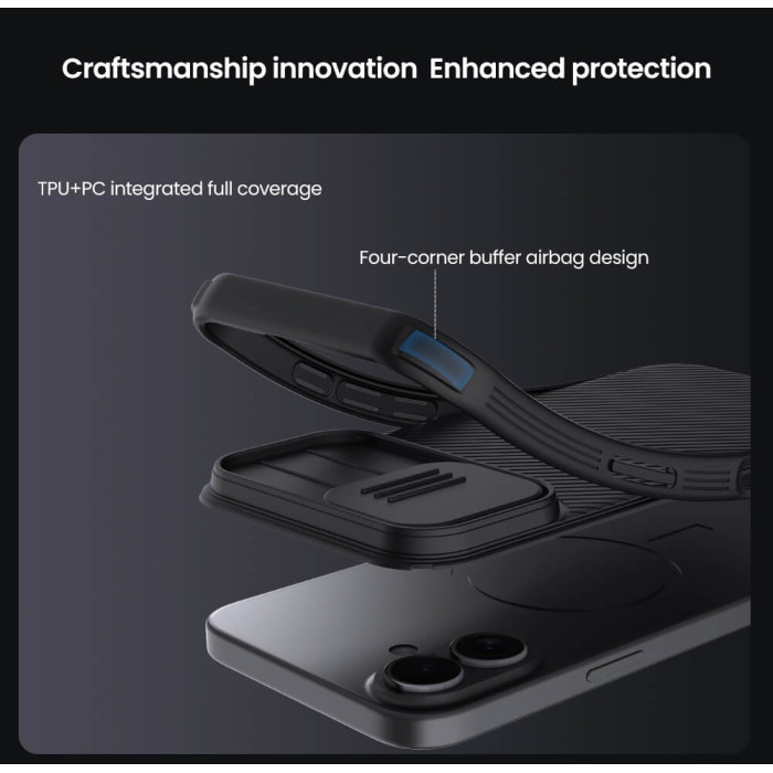 Η θήκη της σειράς CamShield Pro της Nillkin χαρακτηρίζεται από την ενισχυμένη προστασία που προσφέρει, το σκληρό υλικό κατασκευής της με την ανάγλυφη επιφάνεια, αλλά και την έξτρα προστασία των καμερών και της ιδιωτικότητας σας, χάρη στο συρόμενο καπάκι της.
