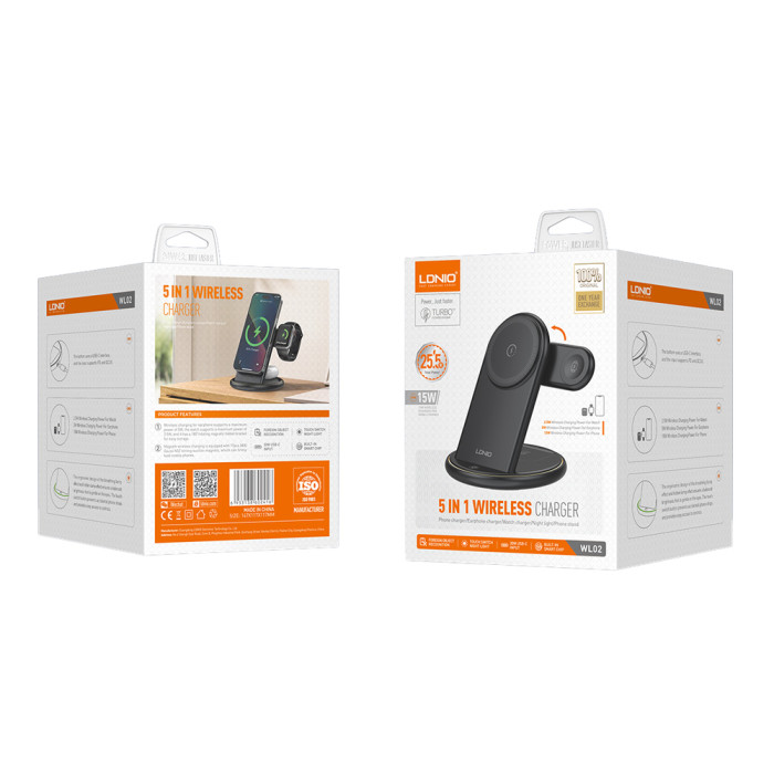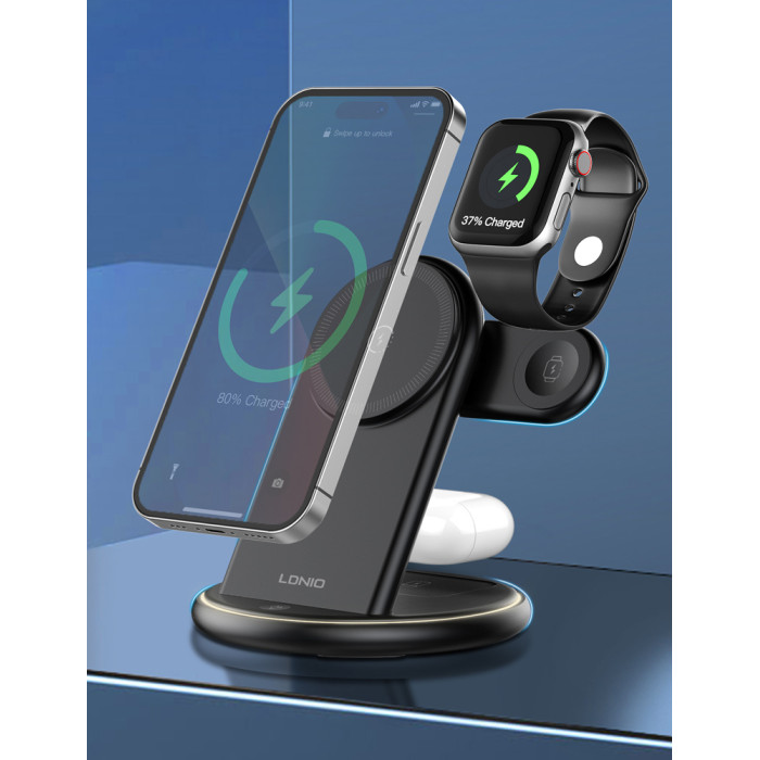 LDNIO ασύρματος φορτιστής WL02 με LED φωτισμό, 3 σε 1, 15W, μαύρος