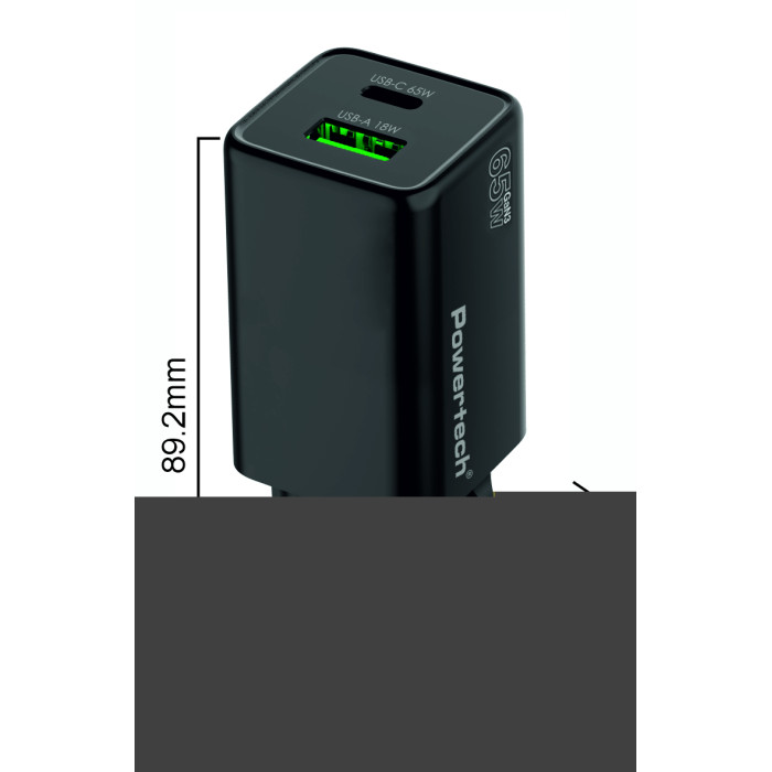 Υψηλής απόδοσης φορτιστής τοίχου της Powertech, κατασκευασμένος από ανθεκτικό υλικό και συμβατός με συσκευές που φορτίζουν μέσω θύρας USB. Διαθέτει USB και USB-C θύρες εξόδου που υποστηρίζουν φόρτιση με μέγιστη απόδοση 65W.
