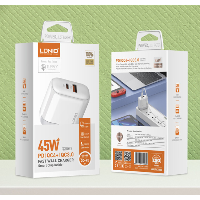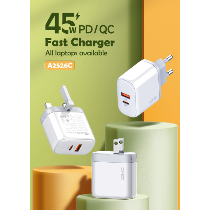 LDNIO φορτιστής τοίχου A2526C με καλώδιο, USB & USB-C, 45W PD, λευκός