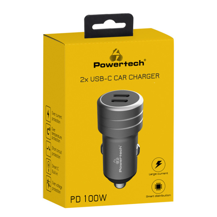 POWERTECH φορτιστής αυτοκινήτου PT-1149, 2x USB-C, 100W PD, γκρι