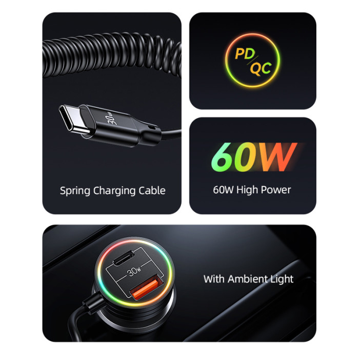 USAMS φορτιστής αυτοκινήτου US-CC167 με καλώδιο, USB/USB-C, 60W, μαύρος