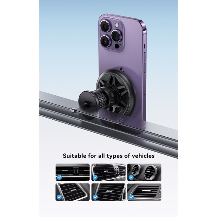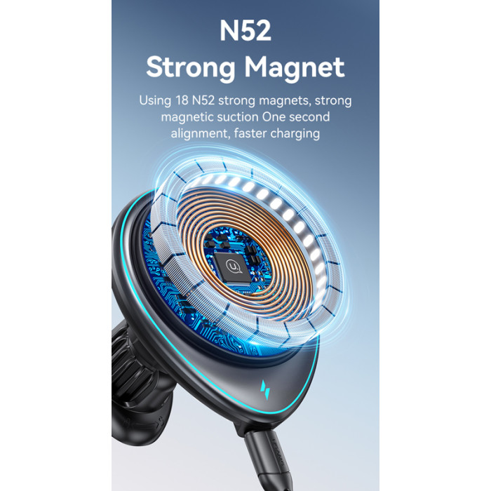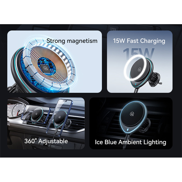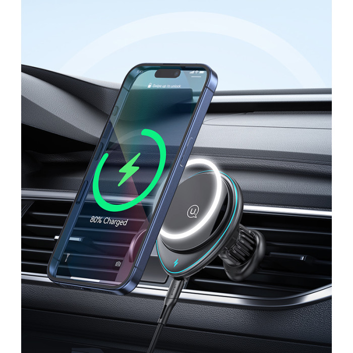Ασύρματος φορτιστής και βάση αυτοκινήτου με στήριξη σε οριζόντιους ή κάθετους αεραγωγούς του αυτοκινήτου. Συγκρατεί το smartphone σταθερό και ασφαλές με ισχυρή μαγνητική δύναμη ενώ παράλληλα το φορτίζει ασύρματα με απόδοση έως 15W.