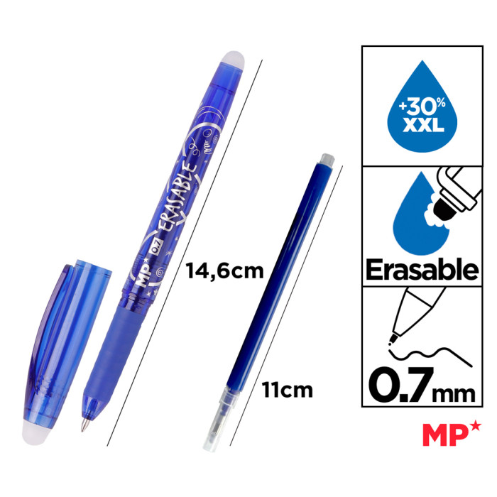 Στυλό διαρκείας της MP με μελάνι που σβήνει μέσω της ειδικής γόμας που διαθέτει. Διαθέτει καπάκι με κλιπ για να ασφαλίζει στις τσέπες των ρούχων και στα τετράδια.