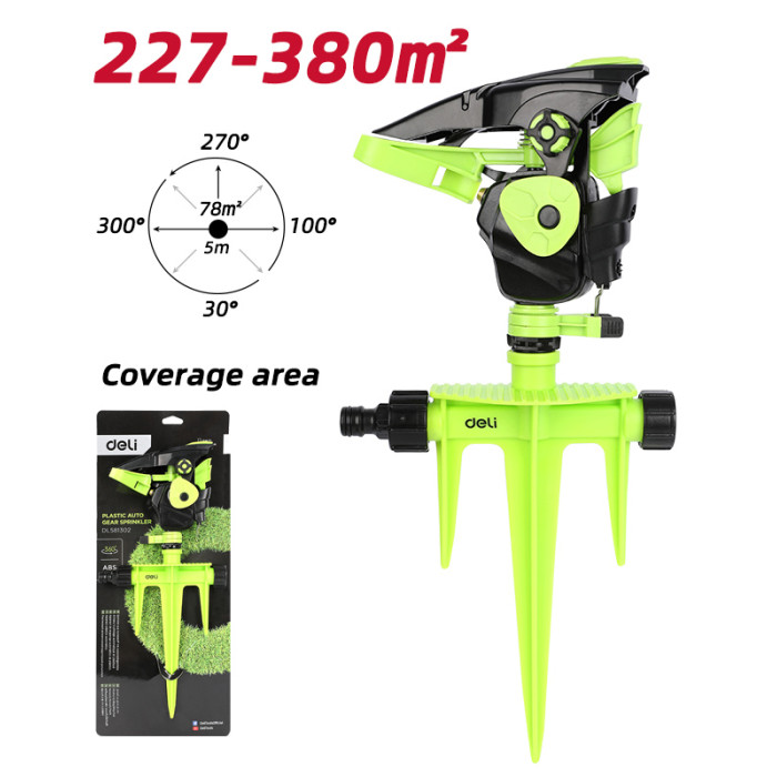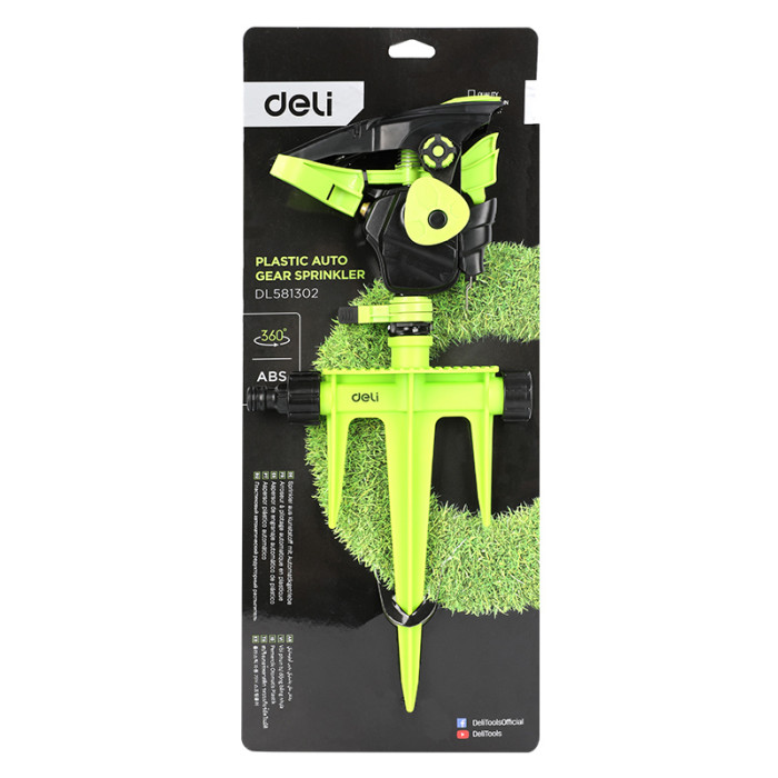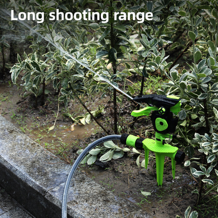 Διαθέτει καρφωτή βάση για εύκολη και σταθερή τοποθέτηση στο έδαφος και δυνατότητα 360° ρύθμισης γωνίας ρίψης, καλύπτοντας ομοιόμορφα μεγάλες επιφάνειες.