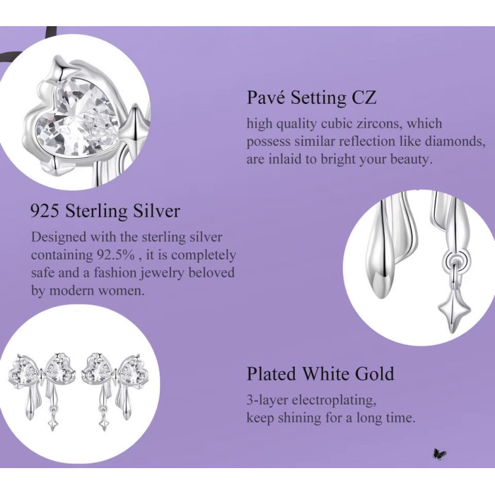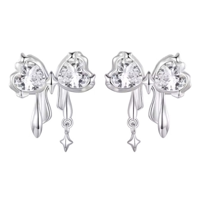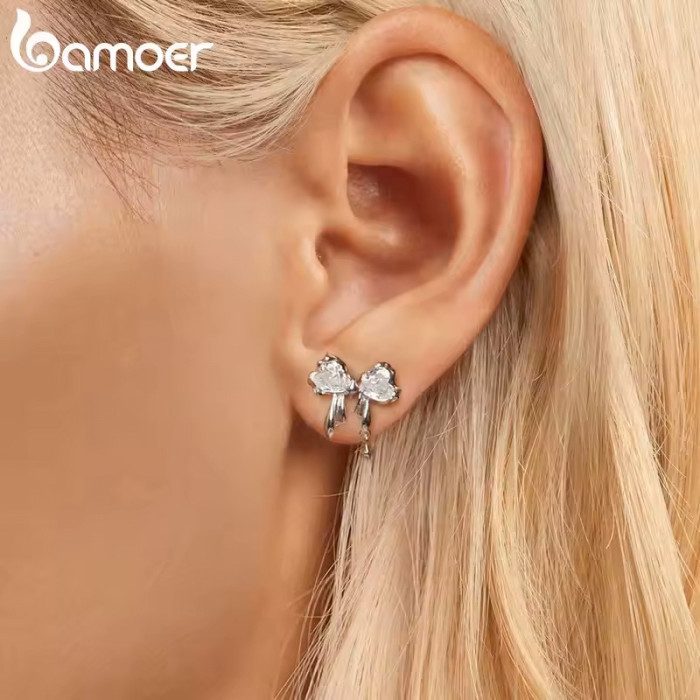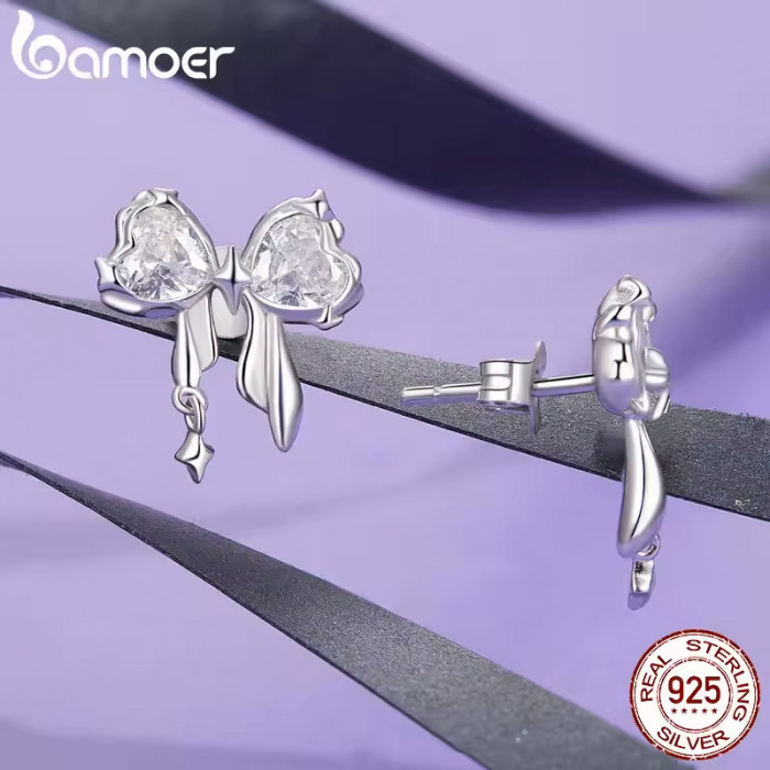 Καρφωτά σκουλαρίκια Bamoer σε σχήμα φιόγκου, διακοσμημένα με αστραφτερή κυβική ζιρκόνια, λευκού χρώματος.