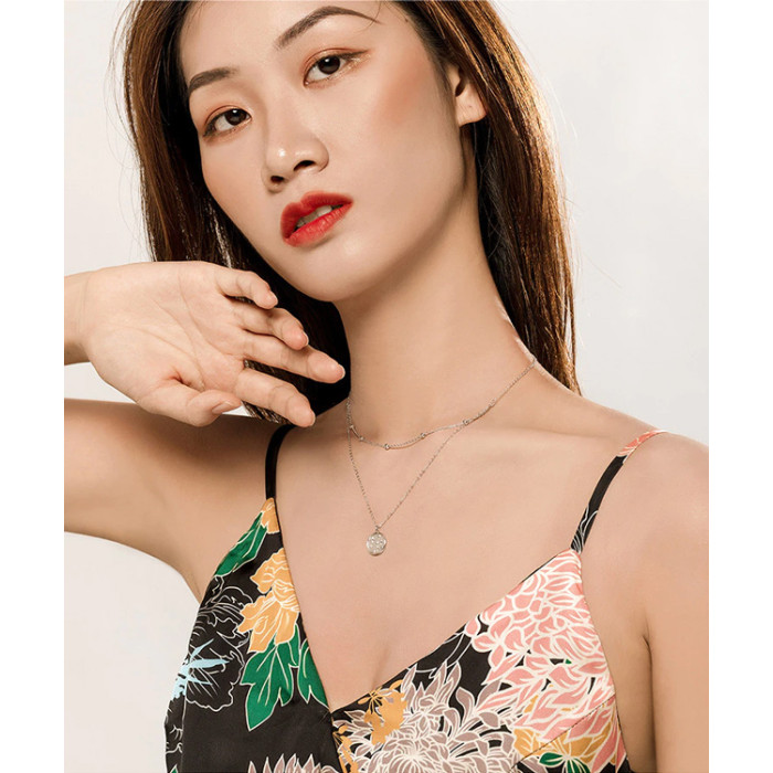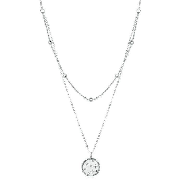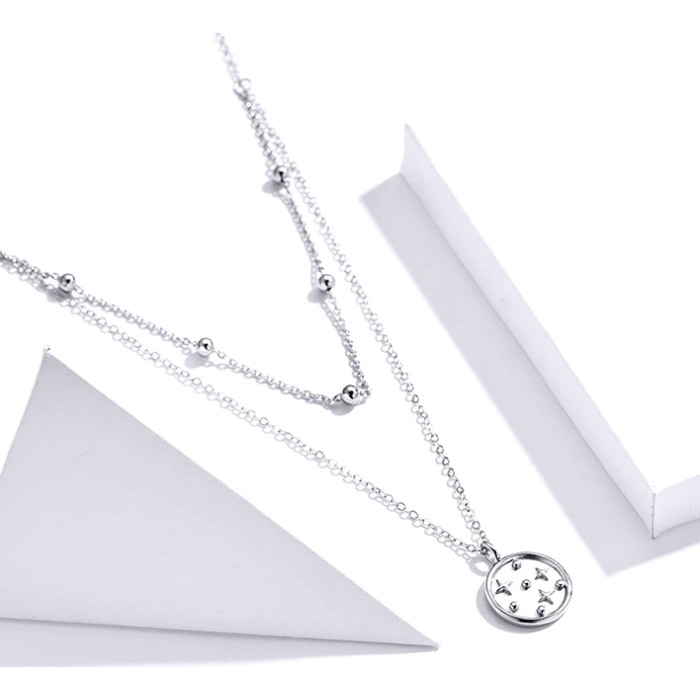 Εντυπωσιακό κολιέ, με ιδιαίτερο και μοναδικό design. Διαθέτει δυο αλυσίδες, η μία διακοσμημένη με μπίλιες και η άλλη με μενταγιόν σε σχήμα κύκλου με μοτίβο αστεριών. Κατασκευάζεται από ασήμι 925 με επιπλατίνωμα.